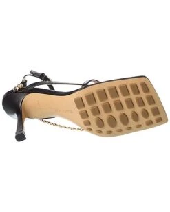 - Stretch Strap Leather Sandal in black leather and gold-tone hardware with strappy design and chain accent