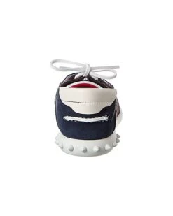 - Geromoc Suede Boat Shoe in navy and brown suede and white leather with self-tie detail and rubber spike embellishments
