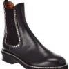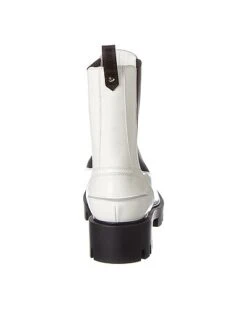 - Montezu Lug Leather Boot in white leather and silver-tone hardware with pull-on tab and spike embellishments