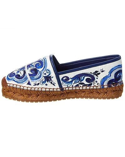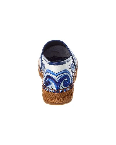 - Brocade Canvas & Leather Espadrille in blue and white canvas with leather trim and jute platform