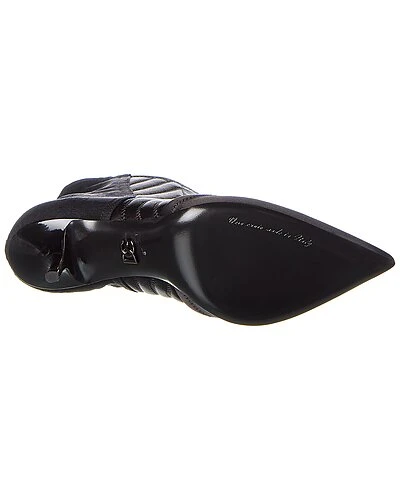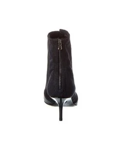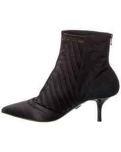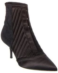 - Corset Satin & Lace Bootie in black satin and lace and silver-tone hardware with hook-and-eye detailing and pointy-toe