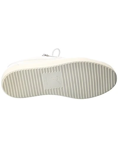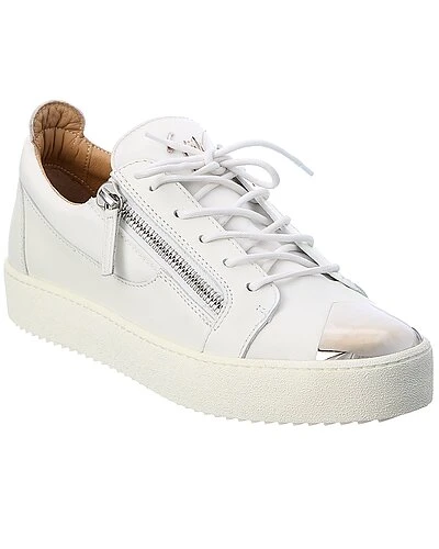 - May London Canvas & Leather Sneaker in white canvas and leather and silver-tone hardware with zipper accents and cap toe