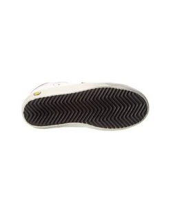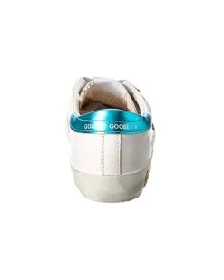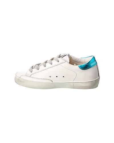 - Superstar Leather Sneaker in white, metallic blue and neon leather with distressed design