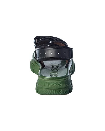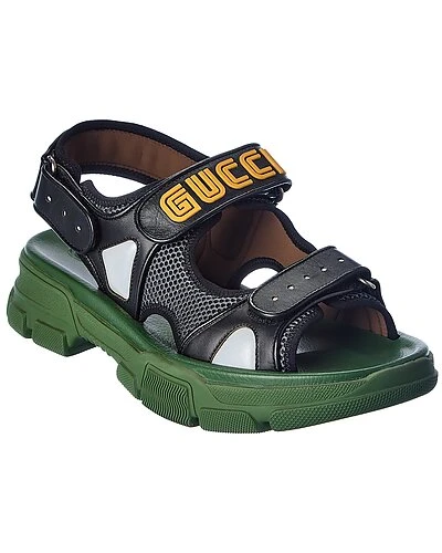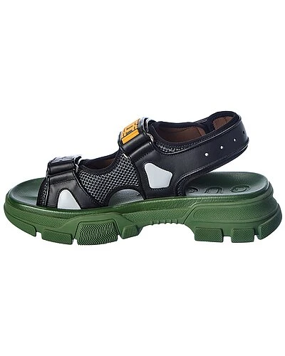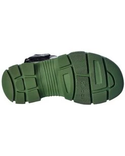 - Leather & Mesh Sandal in black and green leather and mesh and dark silver hardware with cutout design