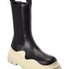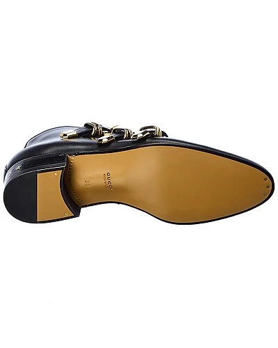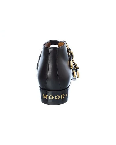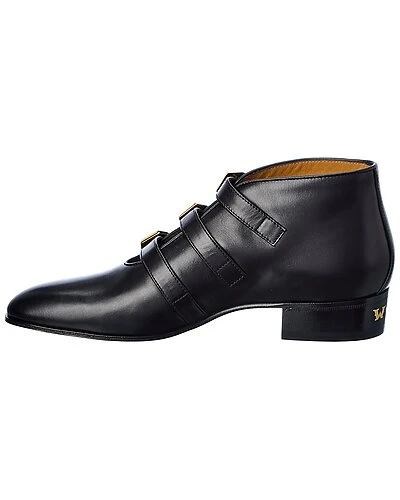- Triple Buckle Leather Bootie in black leather and light fine gold hardware with buckle accents and printed heel