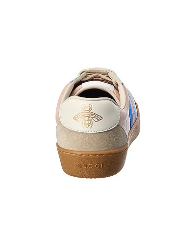 - Web Leather & Suede Sneaker in pink leather and suede and dark silver hardware with red and blue signature webbing detail, interlocking G logo accent and scalloped trim
