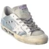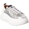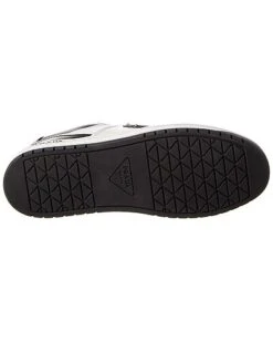 - Downtown Leather Sneaker in white and grey leather and steel finish hardware with perforated detailing and logo accents