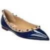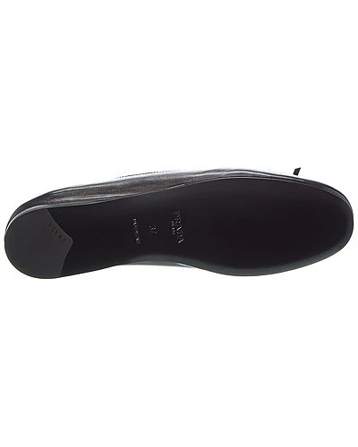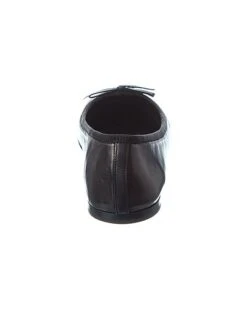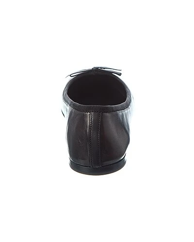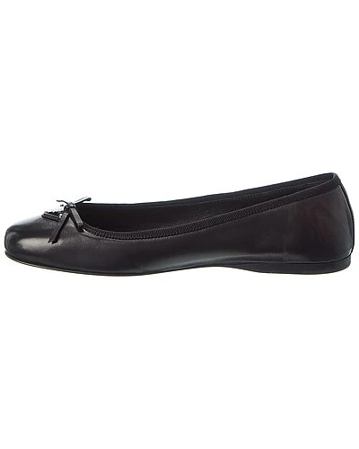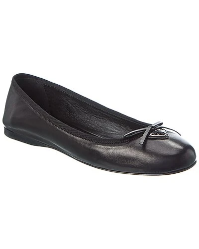 - Logo Leather Ballerina Flat in black leather and steel finish hardware with triangle logo, bow accent and grosgrain trim