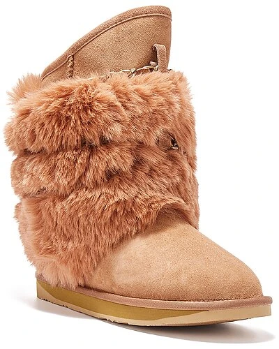 - Atilla Short Sheepskin Boot in chestnut sheepskin and gold-tone hardware with luxe faux fur trim, leather and chain detail