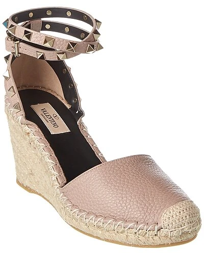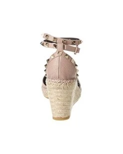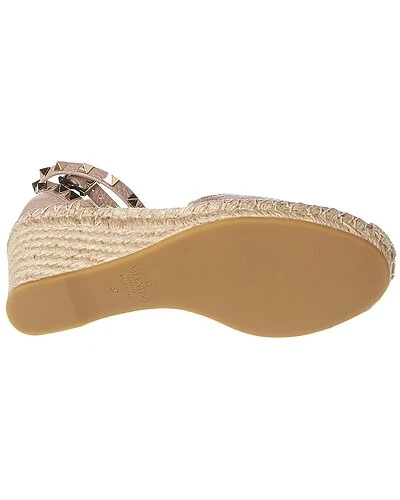 - Rockstud 85 Grainy Leather Wedge Sandal in powder grainy leather with platinum-finish pyramid stud details and jute base