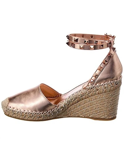 - Rockstud 85 Leather Wedge Sandal in rose gold leather with rose gold-tone rockstuds and metallic woven wedge