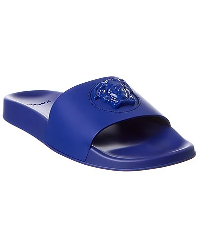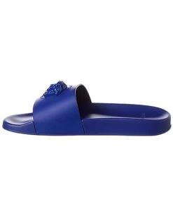 - La Medusa Leather Slide in lapis leather with Medusa head logo accent
